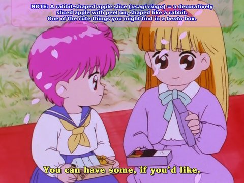 A rabbit-shaped apple slice (usagi ringo) = a decoratively sliced apple with peel on, shaped like a rabbit. One of the cute things you might find in a bento box.